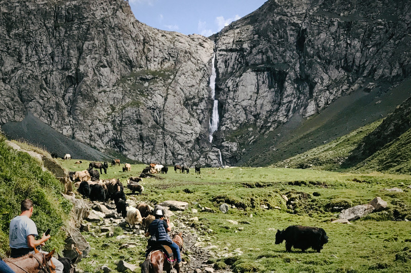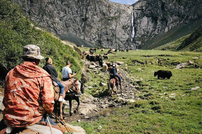 The trek constantly rewards visitors with dynamic vista views down the valley, full of fir trees, grazing yaks, herds of sheep and semi wild horses. Those with keen eyes and good fortune have been known to spot elusive marco polo sheeps on the canyon walls surrounding the waterfall.