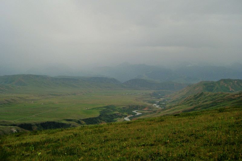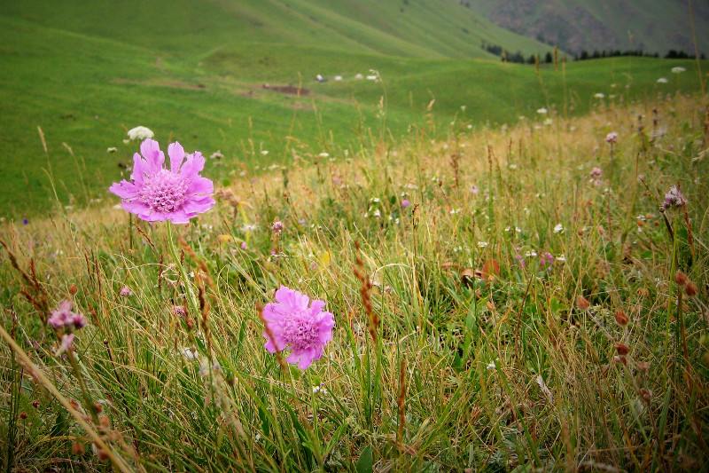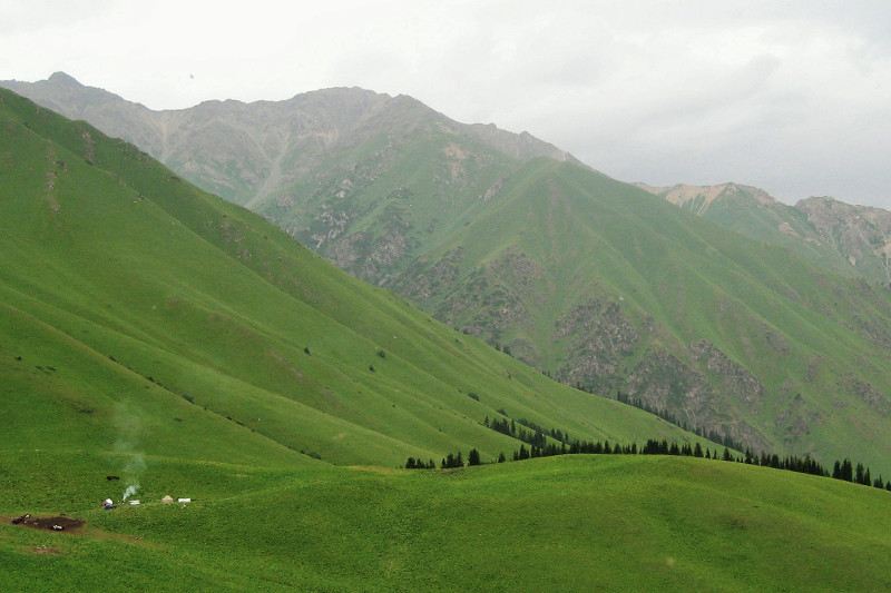 This hike starts at Akel's Yurt Camp, just over the second automobile bridge after (north) of the village of Eki Naryn. There are many jeep and trekking paths in the area, and they all lead to beautiful pastures.